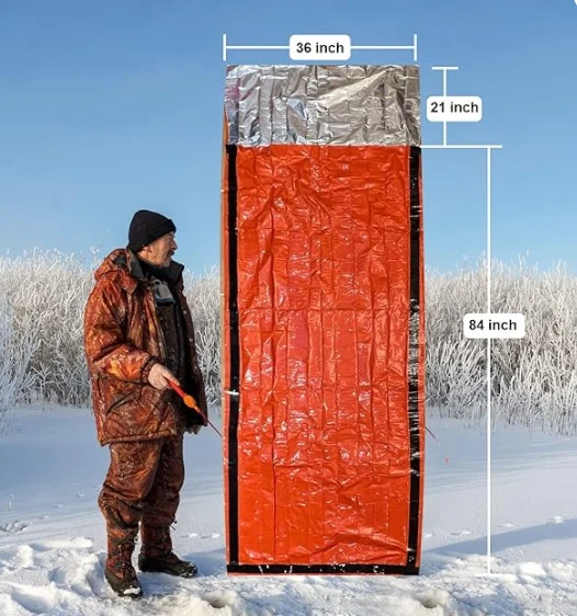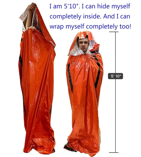 Túi ngủ sống sót khẩn cấp có thể tăng cơ hội sống sót của bạn trong mọi thời tiết, tất cả các mùa và mọi hoàn cảnh. Nó được làm bằng vật liệu Mylar cách nhiệt bền được thiết kế bởi NASA để khám phá không gian. Nó giữ lại / phản ánh trở lại 90% nhiệt cơ thể. Nó có thể tái sử dụng, chống thấm và chống gió.