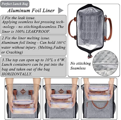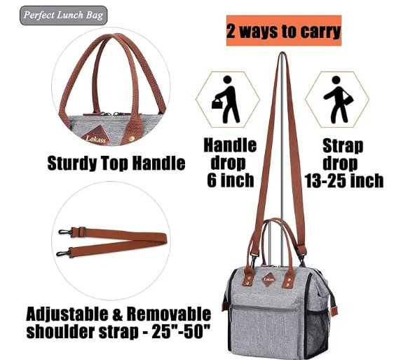 Túi ăn trưa lớn có một ngăn chính (10,5 "x6" x12 "), một túi khóa kéo phía trước lớn (8" x7 "x1.5"), một túi sau (9,5 "x6.5") và 2 túi lưới bên. Tay cầm trên cùng và thiết kế dây đeo vai có thể điều chỉnh & có thể tháo rời (25 "-50") để dễ dàng mang theo.