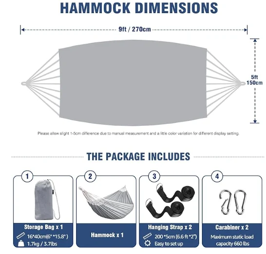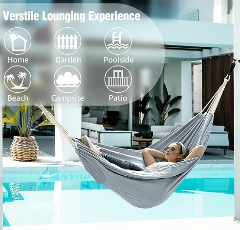 Vật đơn bằng vải ngoài trời võng phù hợp với hình dạng cơ thể của bạn để giảm điểm áp lực và cung cấp thư giãn tối đa. Bông màu có khả năng chống hao mòn và được thiết kế để chịu được việc sử dụng ngoài trời. Và nó có khả năng trọng lượng lên tới 660 pounds.